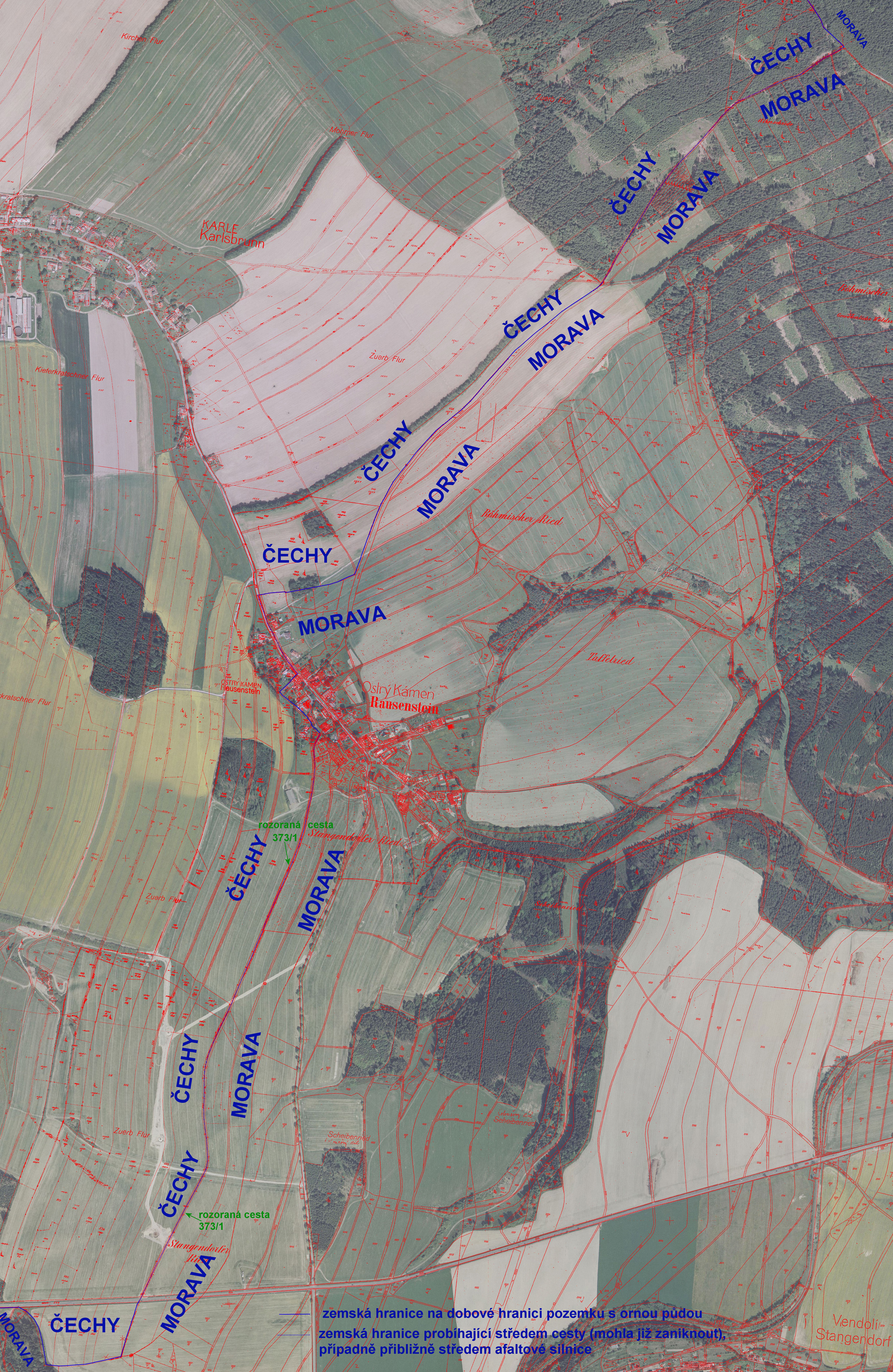 Zemská hranice Čech a Moravy v katastrálním území vsi Ostrý Kámen Bohužel současná internetová katastrální mapa obsahuje chyby ve spojení skenů původních mapových listů, proto jsem ke tvorbě mapy využil historickou mapu pozemkového katastru, kde jsou pouze menší chyby, spočívající v menších, avšak znatelných překryvech skenů původních listů českých a moravských katastrálních papírových katastrálních map (Čechy a Morava používaly odlišné zobrazovací systémy